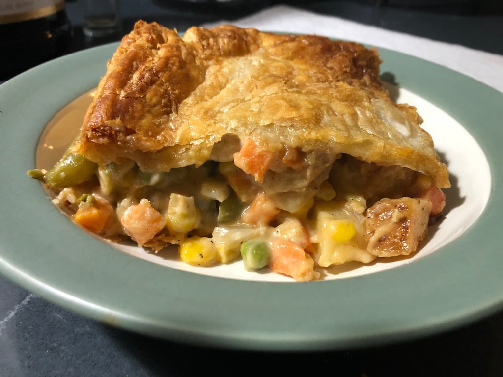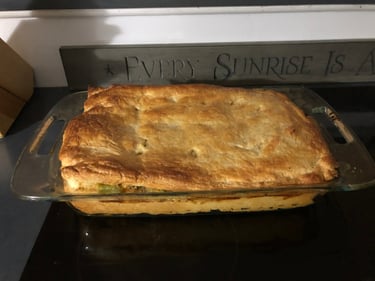 Chicken pot pie with a Vegan Flaky Crust. Most good grocery store sell a vegan flaky rolled crust. You can use chicken made from Butler Soy Curls, Just Chicken plain strips (my favorite), or whatever 'chicken' you like. You will want to pan sear the chicken with some rotisserie chick spice, or at least garlic/onion/pepper to give it a rustic taste. I then used frozen veggies mixed in a pan with Low or No sodium veggie broth and a little AP flour to make the gravy. In the dish, lay on the top, and bake till golden brown.