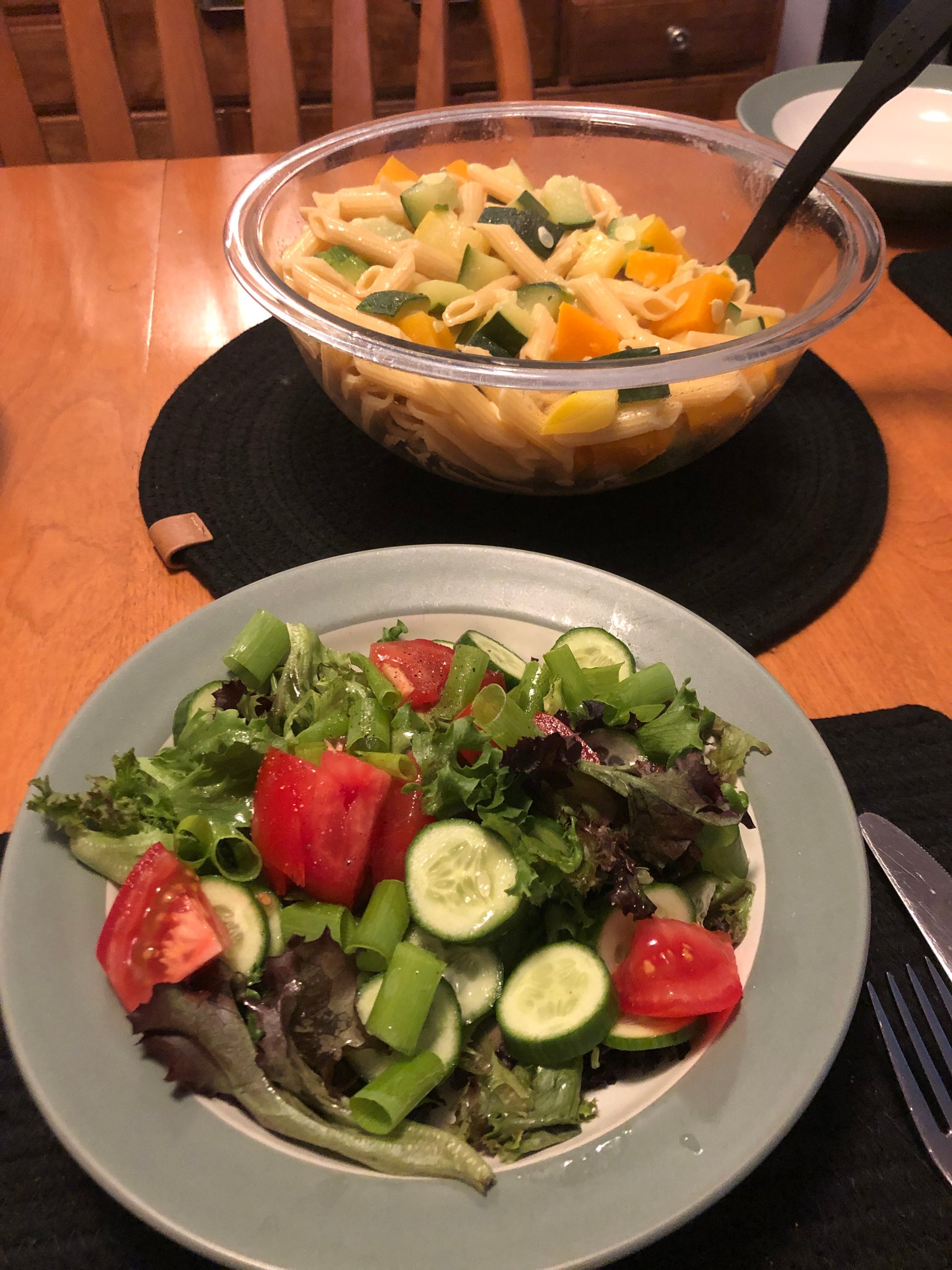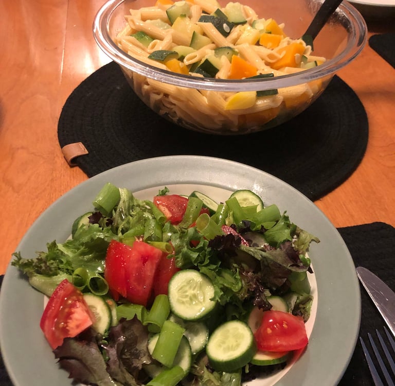 First Meal - Pasta, Veg's, and Salad