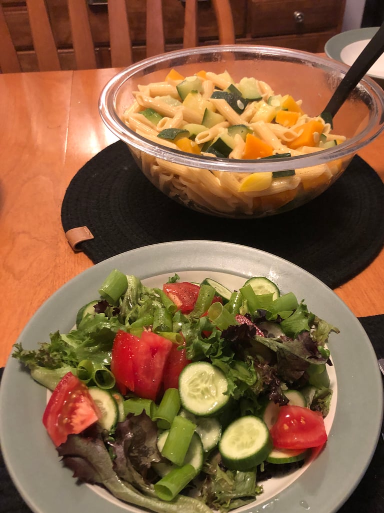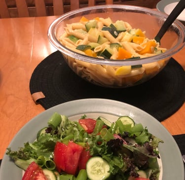 One my first meals when I switched to the WFPB diet. A simple Barilla Protein+ Penne Pasta boiled and added to a saute pan of fresh zucchini, summer squash and butternut squash. I add garlic powder and a touch of salt for taste. Now, in the beginning, you may want to use a little oil to saute, and for a 'sauce' of sorts, but you will end up dropping all oils, I hope. I use Lo or No sodium Vegetable Broth, and I wonderful ingredient called Nutritional Yeast. It gives a fullness to the broth, and can even be used as a full gravy as you will see in other posts. For this bowl, it was 1 cup broth to about two tablespoons of nutritional yeast. I simply paired it with a salad. Again, in the beginning, you might have to go with a little oil, or buy a dairy free dressing from the store to your liking, but eventually we will get into dressings that are WFPB and healthy for you. Let's not go Too Much Too Soon. First meal.
